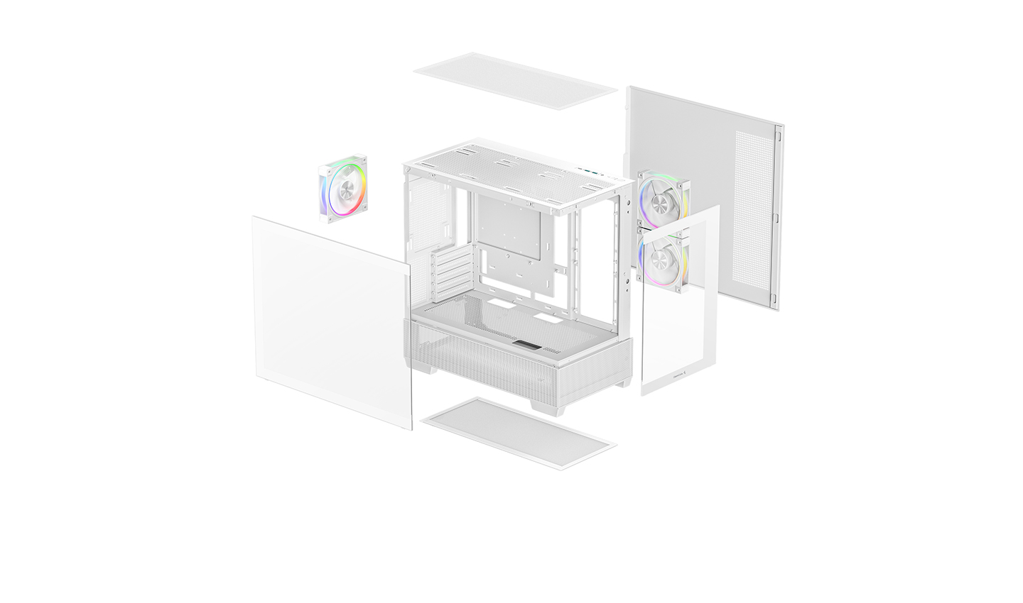 I canali del flusso d'aria disposti con cura mantengono sotto controllo l'accumulo di calore, anche con assemblaggi panoramici. CG380 3F WH supporta fino a 9 ventole da 120 mm e offre supporto per un radiatore di dimensioni fino a 360 mm sulla parte superiore o 240 mm sul lato, consentendo la flessibilità necessaria per un assemblaggio che coniuga prestazioni e stile.