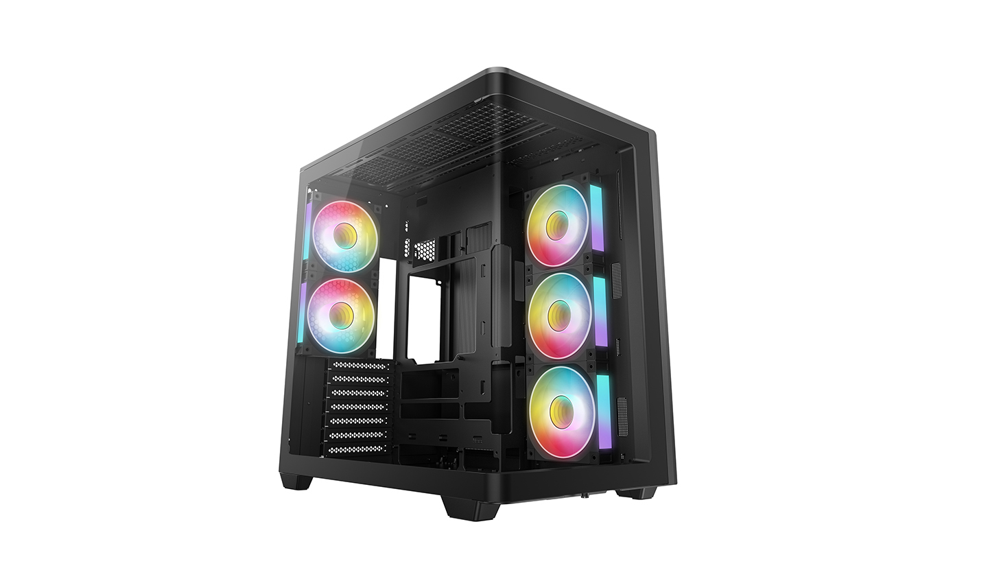 CG590U 5F è un case panoramico con pannello in vetro curvo, progettato con layout a doppia camera e interno spazioso. Con cinque ventole ARGB preinstallate, è pronto da subito con potente flusso d'aria e illuminazione vibrante.