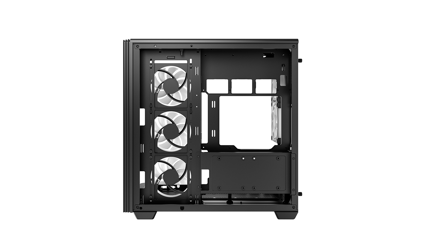 CG590U 5F include doppi supporti per ventole posteriori per migliorare la capacità di scarico. Con tre ventole ARGB da 120 mm a pale inverse sui lati e due unità standard sul retro preinstallate, crea un potente flusso d'aria orizzontale.