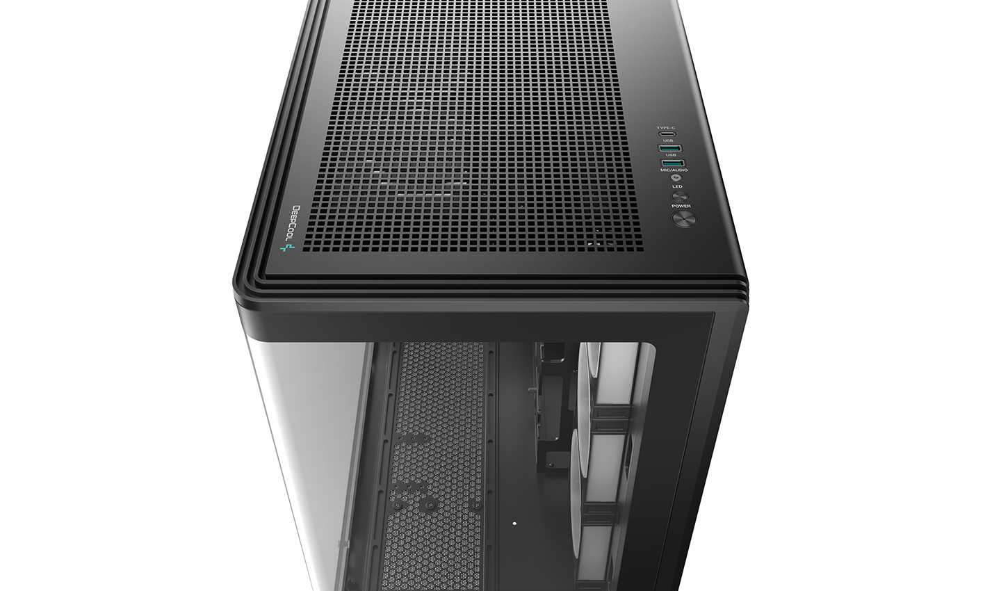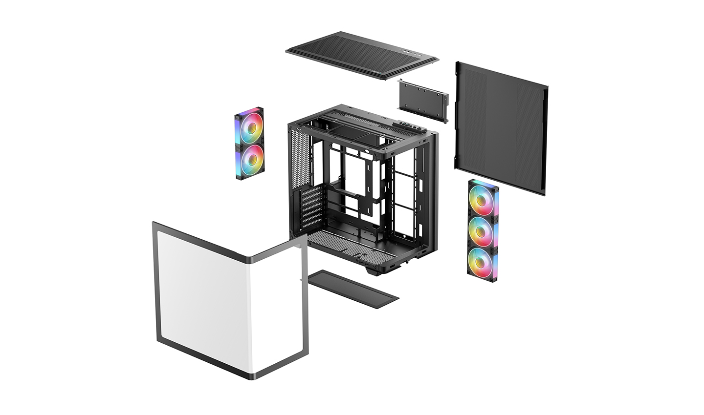 Il layout a doppia camera separa l'alimentatore e le unità in una zona di raffreddamento separata, mantenendo libero il percorso di aspirazione della GPU. Gli ampi pannelli a rete sulla parte superiore e sul lato aumentano la ventilazione in tutto il case.